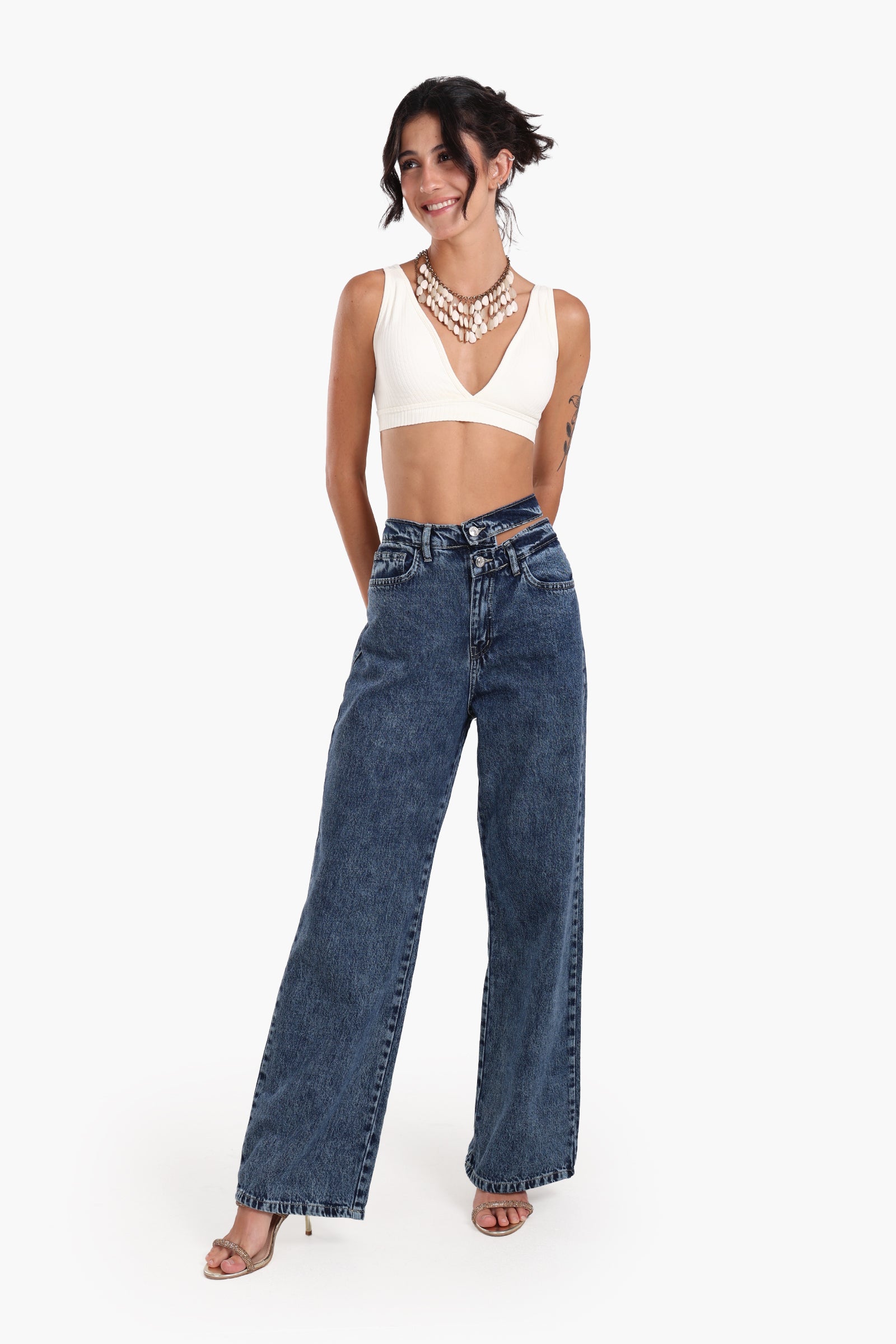 Make a bold statement with these Cutout Waist Wide-Leg Jeans crafted from durable cotton. Featuring a modern medium-wash pattern and a unique waist cutout design, these jeans offer an edgy twist to a timeless silhouette. The high waist with double button and zip fly closure ensures a secure fit, while the wide-leg cut delivers a relaxed and flattering shape. Traditional five-pocket styling adds practicality, and the full-length straight hem completes this fashion-forward look.