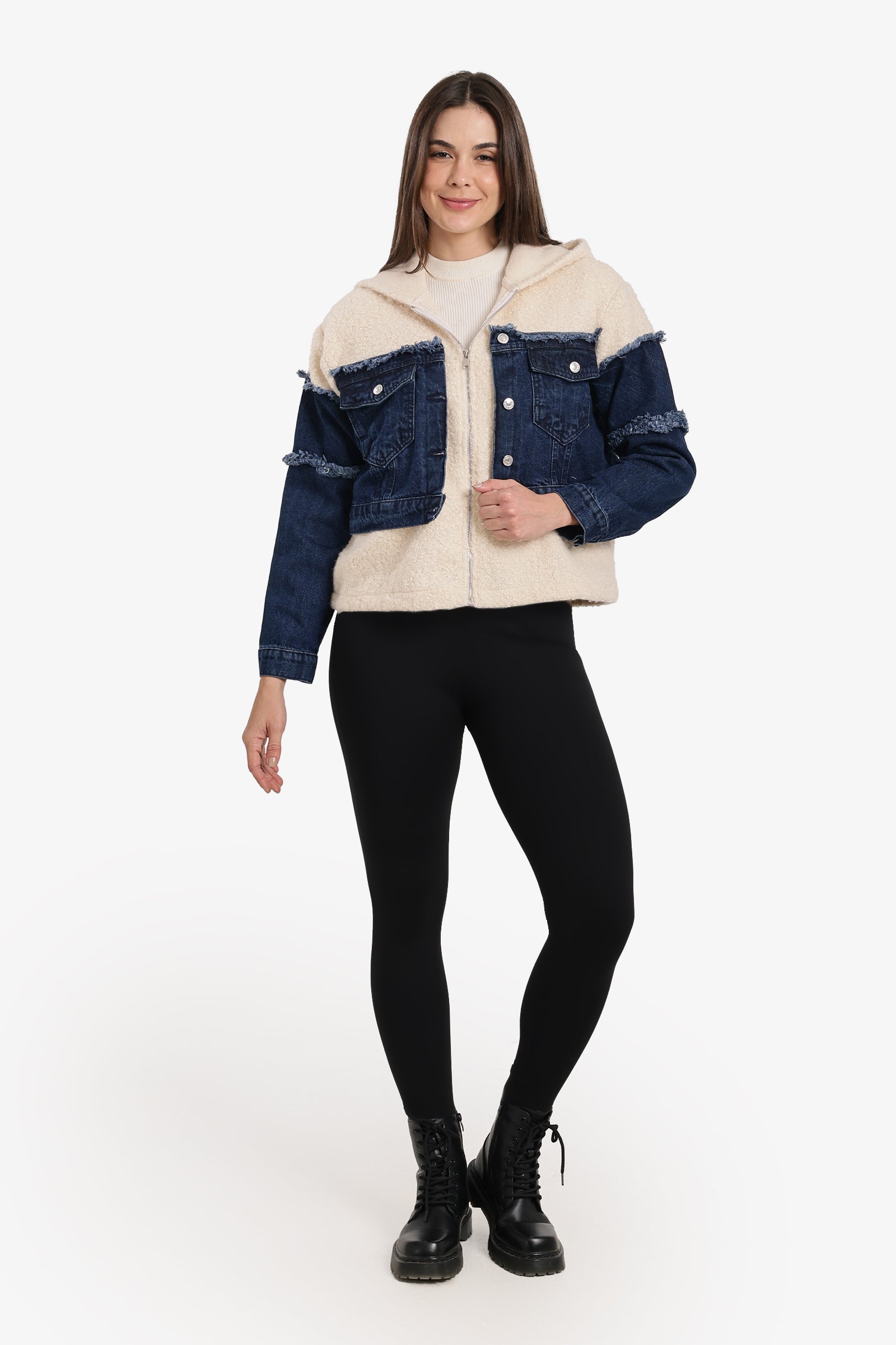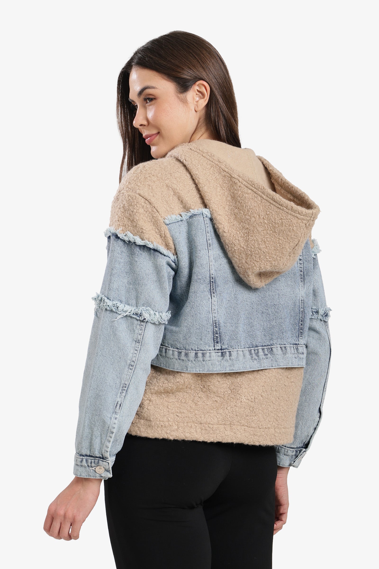 This denim-panel wool jacket blends cozy warmth with a modern, casual edge. Designed in a regular fit, it features contrast denim panels at the chest and sleeves for a statement look, paired with a soft wool-blend body and hooded neck for added comfort. The zip-up front and dropped shoulders enhance its relaxed silhouette, while the hybrid design makes it an easy layering piece for everyday wear.