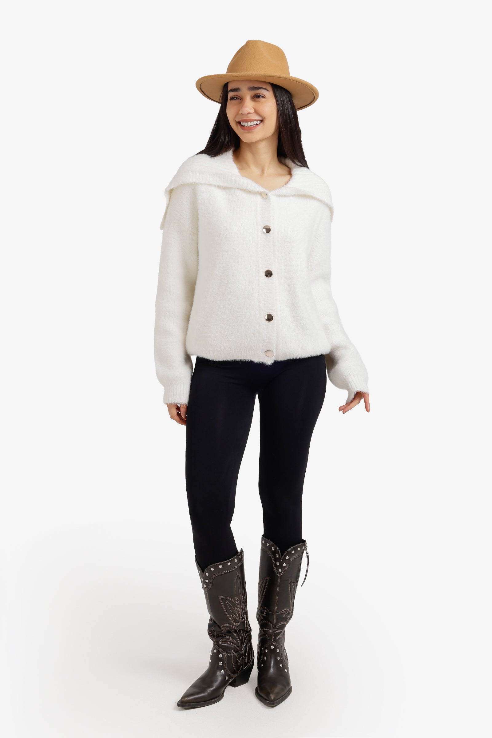 This wool cardigan combines cozy warmth with timeless style, featuring a regular fit and a clean solid pattern for versatile wear. Designed with a fold-over collar, long sleeves, and a button-down front, it offers classic detailing with a polished finish. Ribbed cuffs and collar, along with dropped shoulders, add subtle texture and relaxed charm, making it perfect for layering or wearing on its own.