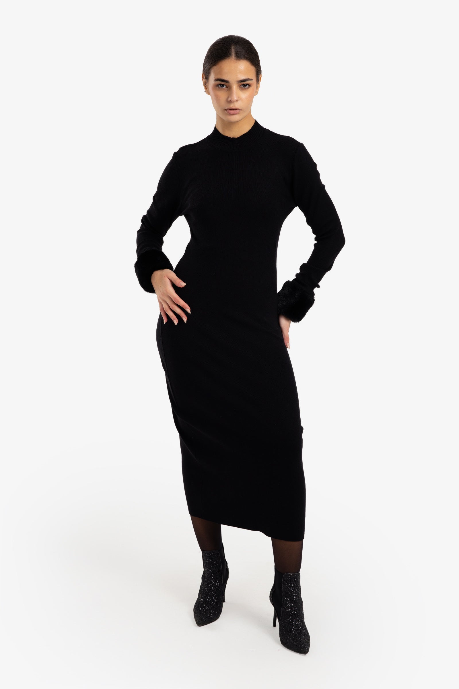 Elevate your winter wardrobe with this slim-fit knit dress, featuring a chic mock neck, long sleeves with luxurious fur cuffs, and a flattering midi length. Designed for easy slip-on wear, its plain pattern makes it versatile for both casual and dressy occasions.