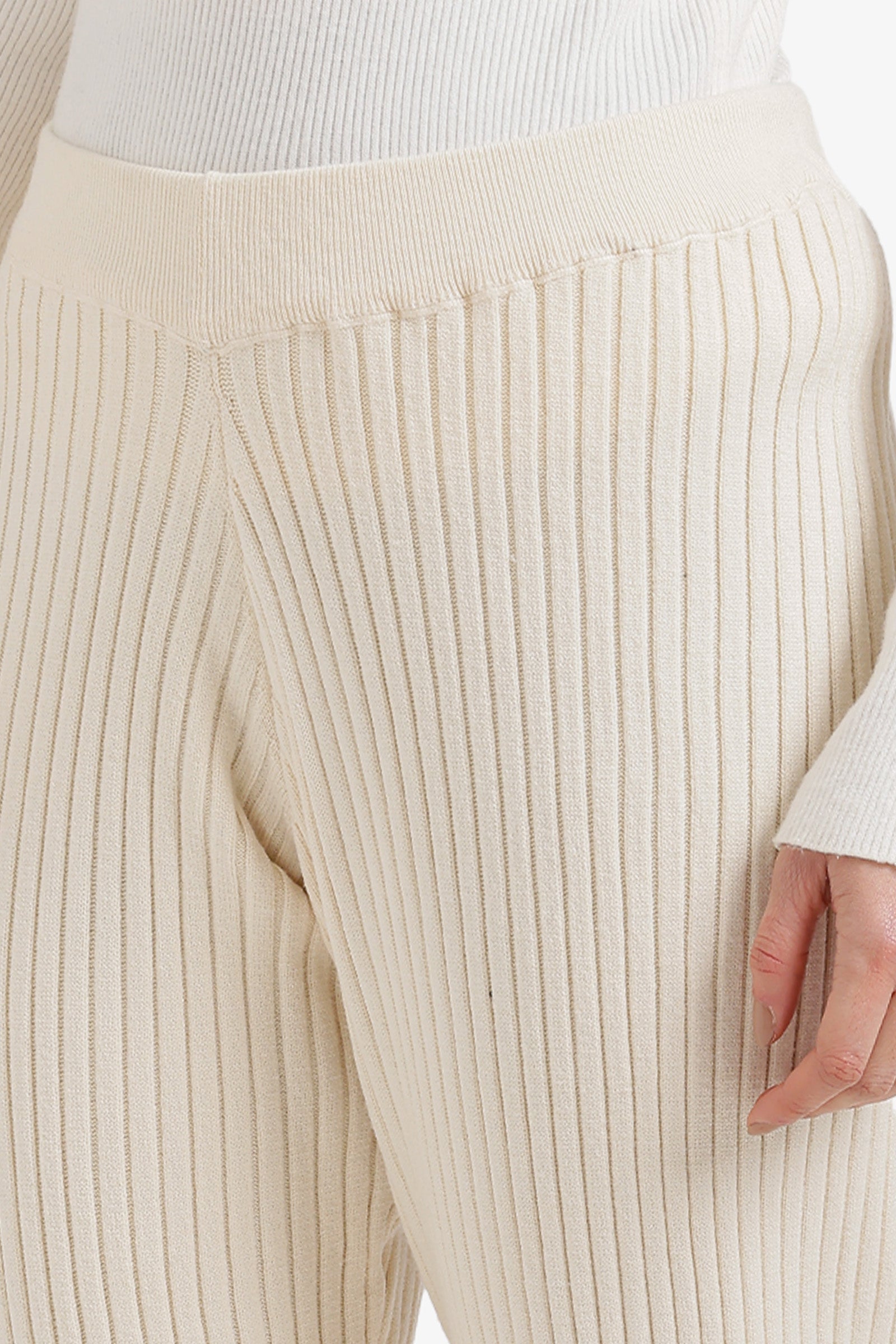 This knit pants is designed in a comfortable regular fit with a subtle ribbed pattern that adds texture and visual interest. Featuring an elasticated waist for easy wear and all-day comfort, it flows into a flattering flare leg that creates an elegant, balanced silhouette. Finished in a full-length design, this style effortlessly combines comfort and polish, making it a versatile choice for both casual and elevated looks.