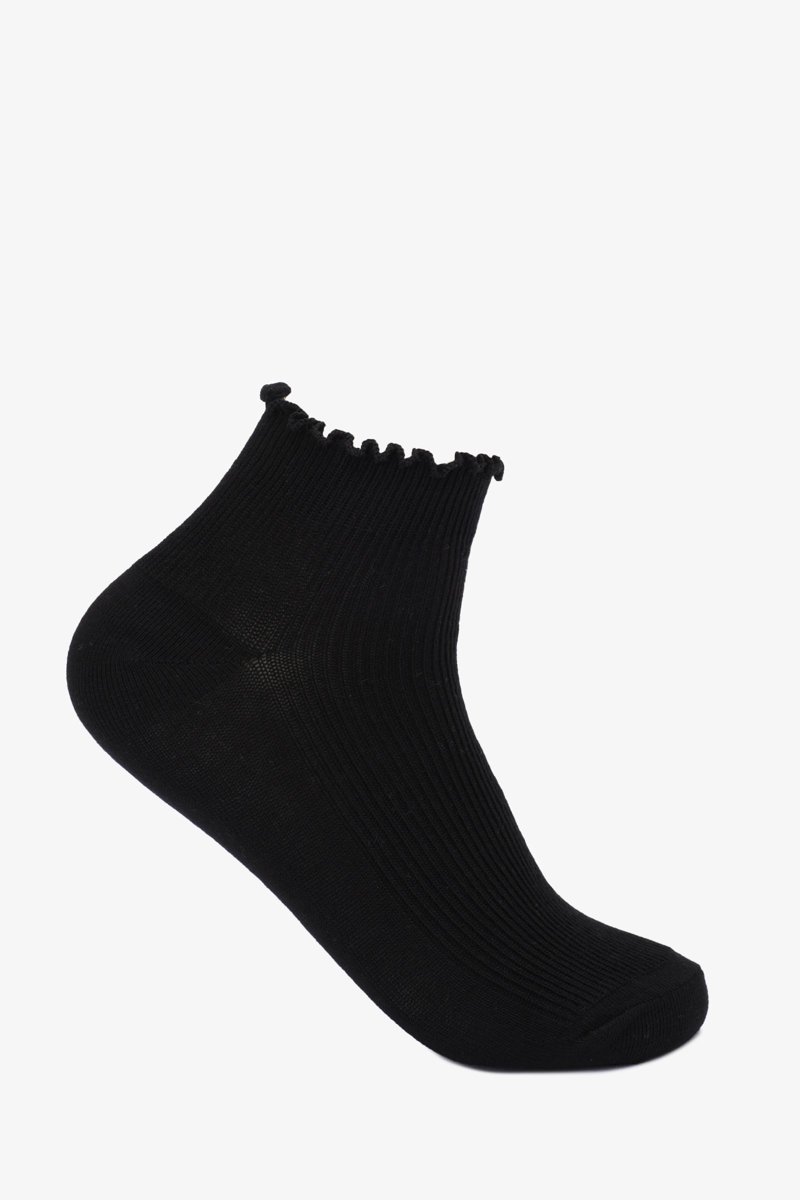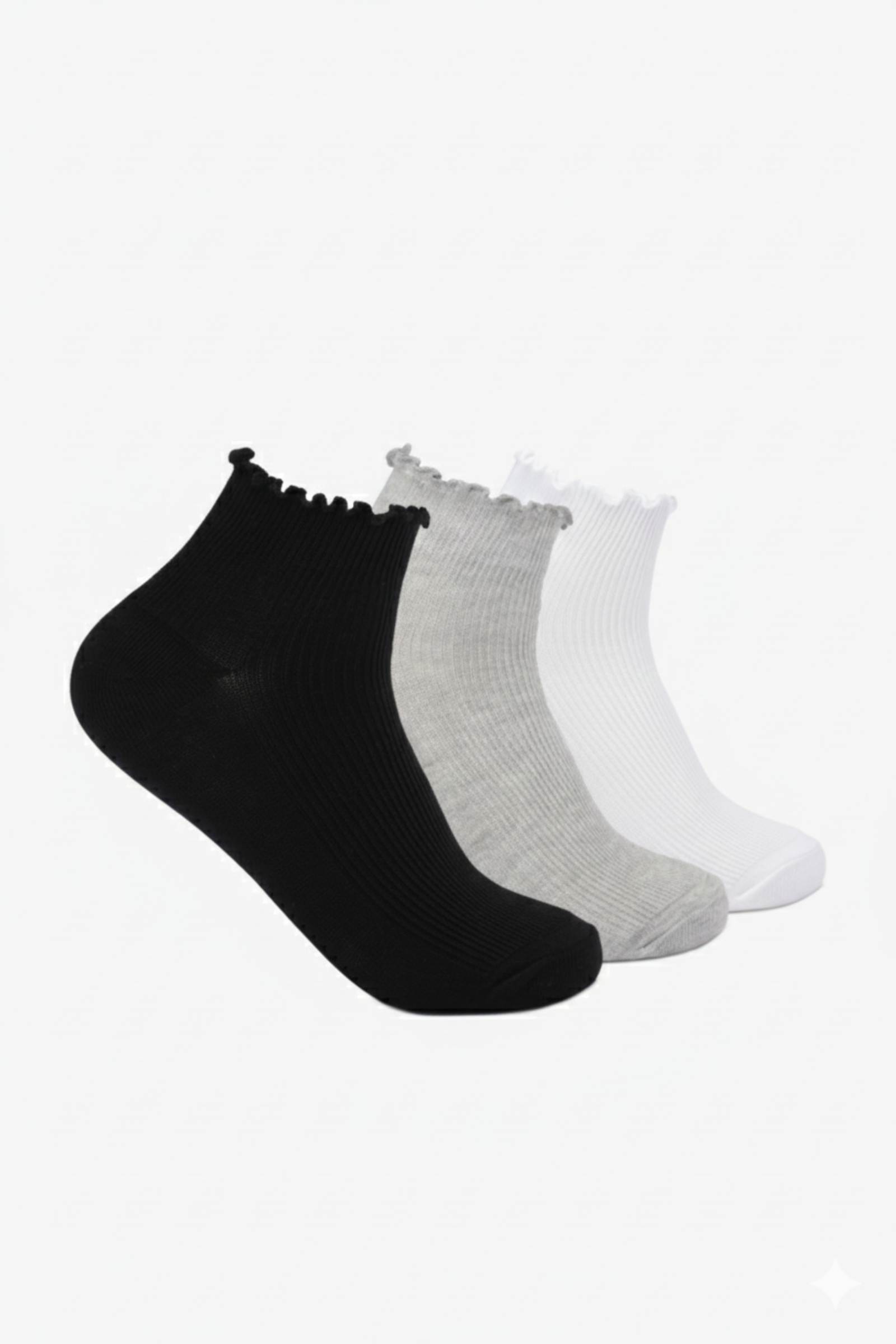 These ankle-length socks are crafted from a soft, breathable fabric that ensures all-day comfort. Designed with a ribbed texture for a secure yet flexible fit, they feature a stretchy cuff finished with a delicate ruffled edge for a subtle feminine touch. Lightweight and easy to wear, they’re perfect for everyday use and pair effortlessly with casual outfits.